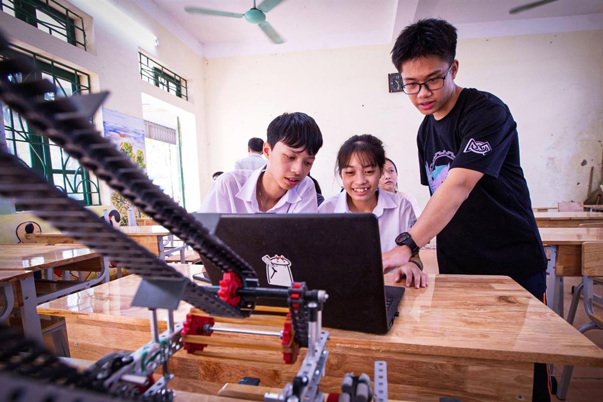 Học sinh trải nghiệm công nghệ Robotics, lắp đặt các bộ kit, lập trình các hoạt động của robot trên máy tính, tìm hiểu công nghệ AI _Ảnh: TTXVN