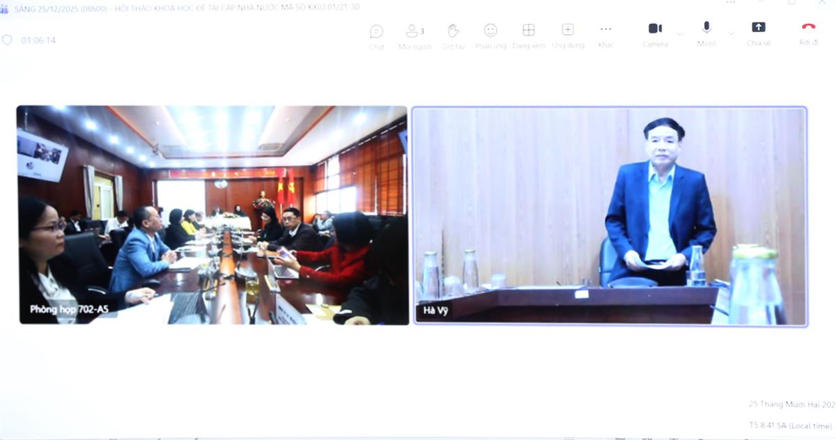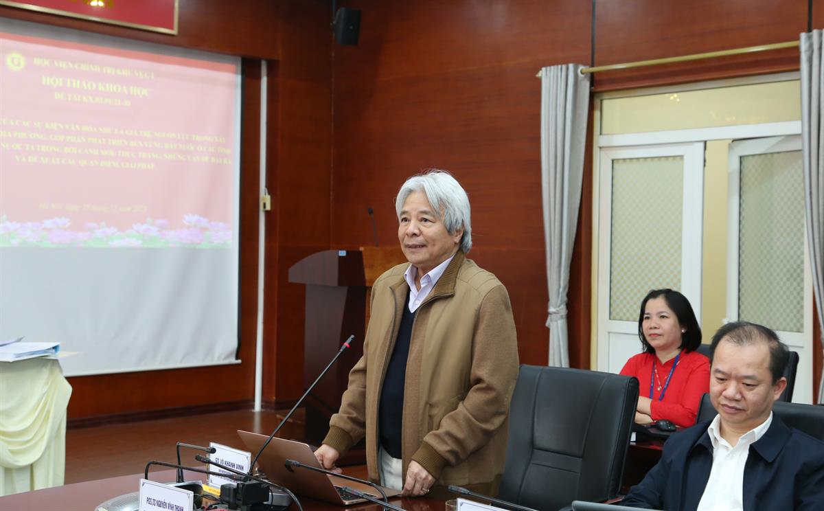 GS,TS Võ Khánh Vinh, Nguyên Phó Chủ tịch Viện Hàn lâm Khoa học xã hội Việt Nam, Chủ nhiệm chương trình KX.03/21-30 phát biểu tại Hội thảo