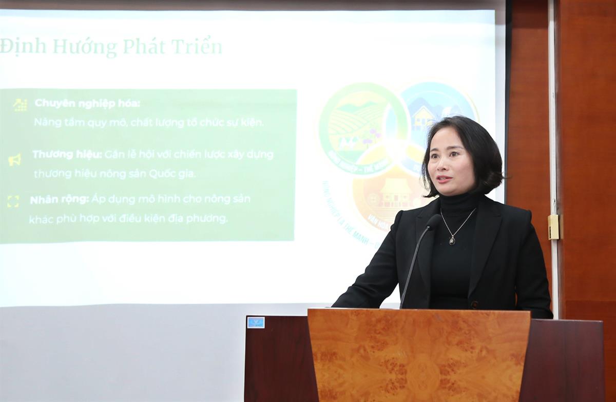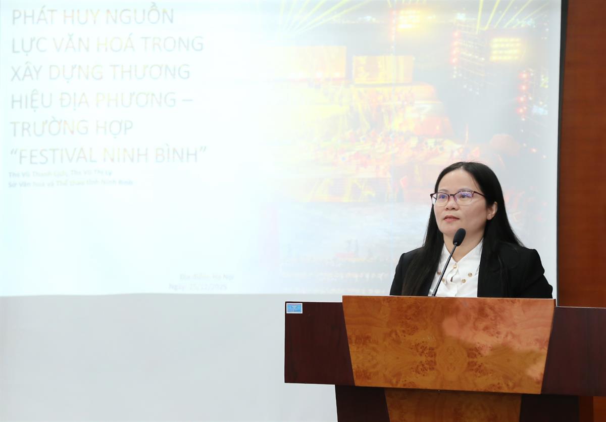 ThS Vũ Thị Lý, Phó Trưởng phòng Di sản Văn hoá, Sở Văn hoá và Thể thao tỉnh Ninh Bình trình bày tham luận “Phát huy nguồn lực văn hoá trong xây dựng thương hiệu - trường hợp Festival Ninh Bình”