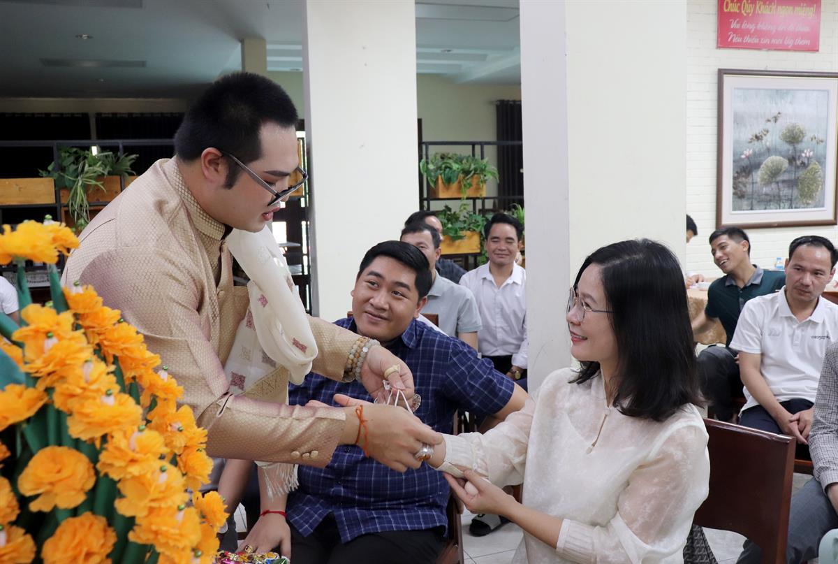 Tại Tết cổ truyền Bun Pi May năm 2026, các đại biểu tham dự đã tham gia nghi thức buộc chỉ cổ tay, đây là nghi lễ mang ý nghĩa cầu phúc cho năm mới mạnh khỏe và gặp nhiều may mắn trong cuộc sống.