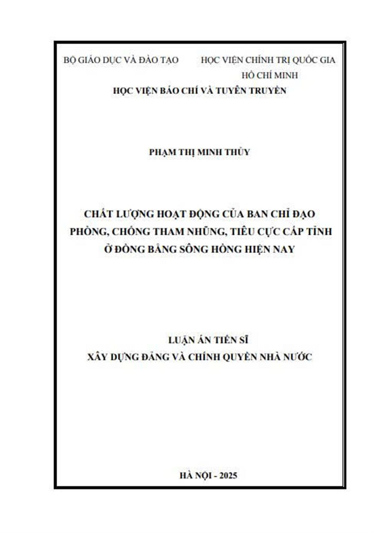 Tổng quan giới thiệu Luận án Tiến sĩ “Chất lượng hoạt động của Ban Chỉ đạo phòng, chống tham nhũng, tiêu cực cấp tỉnh ở đồng bằng sông Hồng”