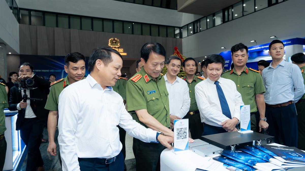 Đại tướng Lương Tam Quang, Ủy viên Bộ Chính trị, Bí thư Đảng ủy Công an Trung ương, Bộ trưởng Bộ Công an tham quan gian trưng bày các sản phẩm của MobiFone, tại sự kiện Ngày An ninh mạng Việt Nam lần thứ nhất_Ảnh: cand.com.vn
