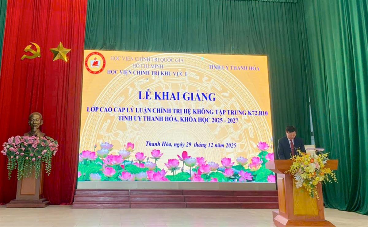 Dự Lễ khai giảng có: TS Phạm Thị Ngọc Dung, Phó Giám đốc Học viện Chính trị khu vực I; đồng chí Lê Xuân Thu, Ủy viên Ban Chấp hành Đảng bộ Tỉnh, Phó Trưởng Ban Thường trực Ban Tổ chức Tỉnh ủy Thanh Hóa; đại diện lãnh đạo Ban Quản lý đào tạo, bồi dưỡng, Văn phòng Học viện; đồng chí Nguyễn Thành Lương, Uỷ viên Ban Chấp hành Đảng bộ Tỉnh, Hiệu Trưởng trường Chính trị tỉnh Thanh Hóa; đại diện Lãnh đạo Văn phòng Ban Tổ chức Tỉnh ủy và 56 đồng chí học viên lớp CCLLCT hệ không tập trung K72.B10 Tỉnh uỷ Thanh Hóa, khoá học 2025 - 2027.