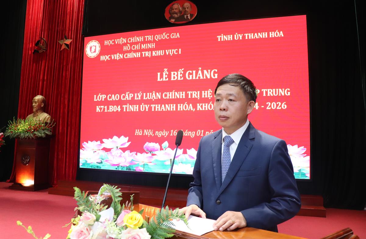 Thay mặt tập thể lớp K71.B04, học viên Hoàng Văn Tuấn bày tỏ lòng tri ân sâu sắc tới Ban Giám đốc Học viện Chính trị khu vực I cùng toàn thể cán bộ, giảng viên đã tận tâm truyền thụ tri thức khoa học, đồng thời là những tấm gương mẫu mực về đạo đức, phong cách và phương pháp công tác. Đồng chí Hoàng Văn Tuấn trân trọng cảm ơn Thường trực Tỉnh ủy Thanh Hóa, Ban Tổ chức Tỉnh ủy Thanh Hóa và Trường Chính trị tỉnh Thanh Hóa đã luôn quan tâm, tạo điều kiện thuận lợi để lớp hoàn thành tốt khóa học. Thay mặt 58 học viên, đồng chí xin hứa sẽ vận dụng sáng tạo kiến thức đã tiếp thu vào thực tiễn công tác, không ngừng tu dưỡng, rèn luyện bản lĩnh chính trị, góp phần xây dựng cơ quan, đơn vị vững mạnh và đóng góp thiết thực vào sự phát triển của tỉnh Thanh Hóa theo mục tiêu Nghị quyết số 58 của Bộ Chính trị đã đề ra.