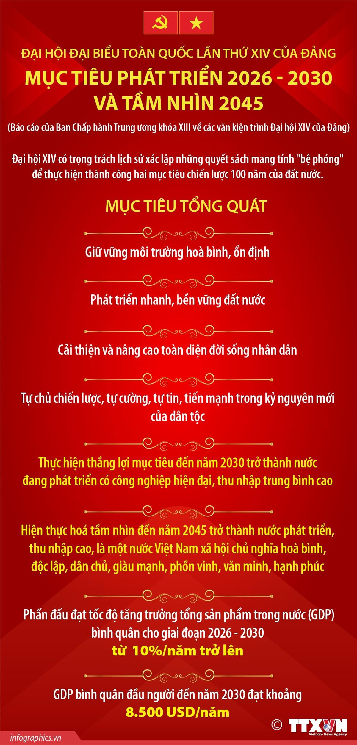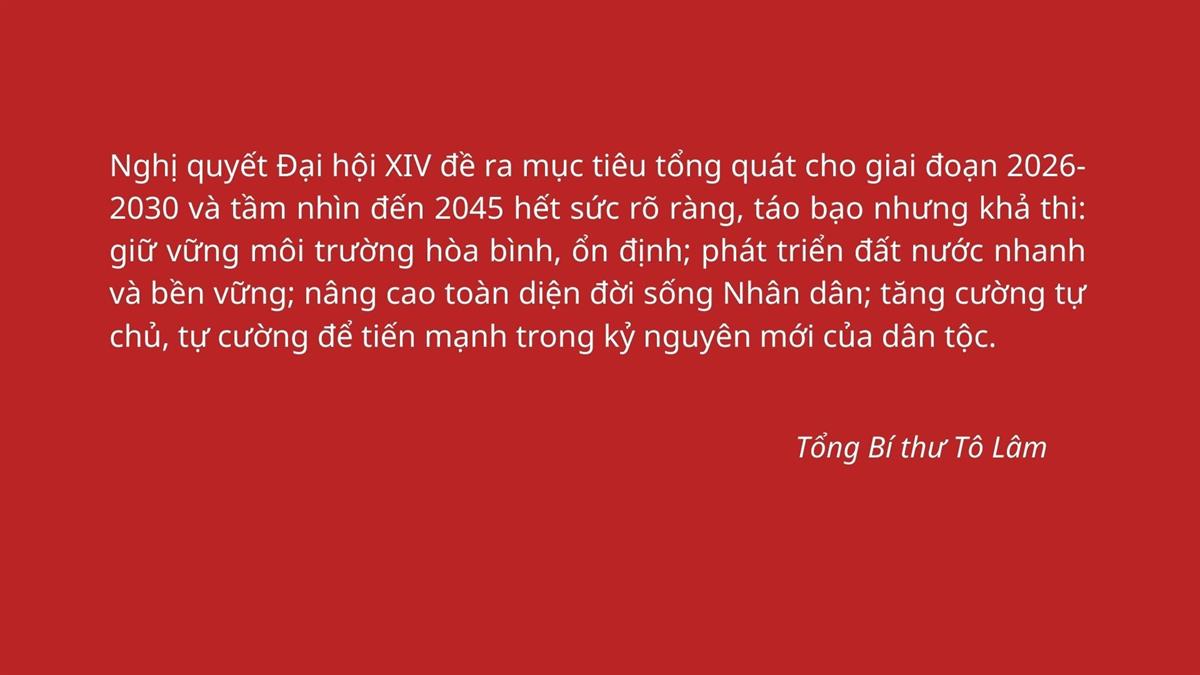 Nghị quyết Đại hội XIV đề ra mục tiêu tổng quát cho giai đoạn 2026-2030 và tầm nhìn đến 2045 hết sức rõ ràng, táo bạo nhưng khả thi: giữ vững môi trường hòa bình, ổn định; phát triển đất nước nhanh và bền vững; nâng cao toàn diện đời sống Nhân dân; tăng cường tự chủ, tự cường để tiến mạnh trong kỷ nguyên mới của dân tộc.