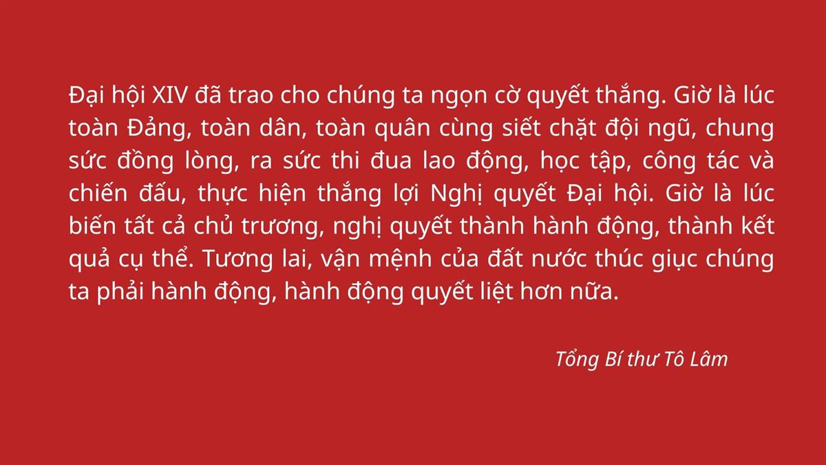 Đại hội XIV đã trao cho chúng ta ngọn cờ quyết thắng. Giờ là lúc toàn Đảng, toàn dân, toàn quân cùng siết chặt đội ngũ, chung sức đồng lòng, ra sức thi đua lao động, học tập, công tác và chiến đấu, thực hiện thắng lợi Nghị quyết Đại hội. Giờ là lúc biến tất cả chủ trương, nghị quyết thành hành động, thành kết quả cụ thể. Tương lai, vận mệnh của đất nước thúc giục chúng ta phải hành động, hành động quyết liệt hơn nữa.