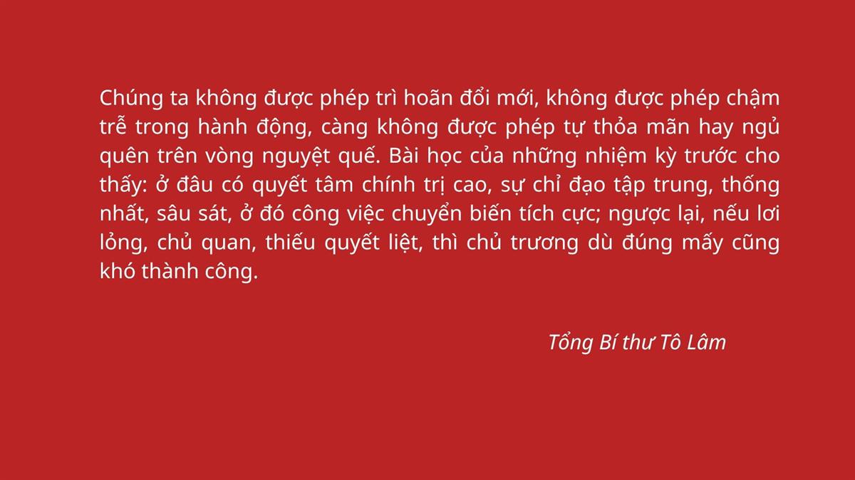 Chúng ta không được phép trì hoãn đổi mới, không được phép chậm trễ trong hành động, càng không được phép tự thỏa mãn hay ngủ quên trên vòng nguyệt quế. Bài học của những nhiệm kỳ trước cho thấy: ở đâu có quyết tâm chính trị cao, sự chỉ đạo tập trung, thống nhất, sâu sát, ở đó công việc chuyển biến tích cực; ngược lại, nếu lơi lỏng, chủ quan, thiếu quyết liệt, thì chủ trương dù đúng mấy cũng khó thành công.