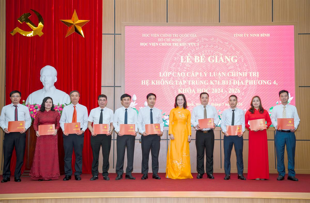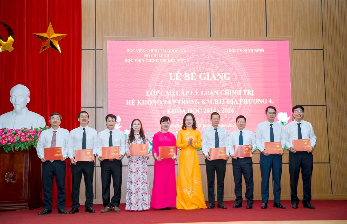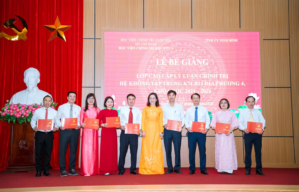 Dự Lễ bế giảng có TS Phạm Thị Ngọc Dung, Phó Giám đốc Học viện; đồng chí Đinh Việt Dũng, Ủy viên Ban Thường vụ Tỉnh ủy, Trưởng ban Tổ chức Tỉnh ủy Ninh Bình;đại diện lãnh đạo các đơn vị thuộc Học viện; Ban Giám hiệu trường Chính trị tỉnh Ninh Bình và 49 học viên lớp CCLLCT hệ không tập trung K71.B12 Địa phương 4, khoá học 2024 - 2026.