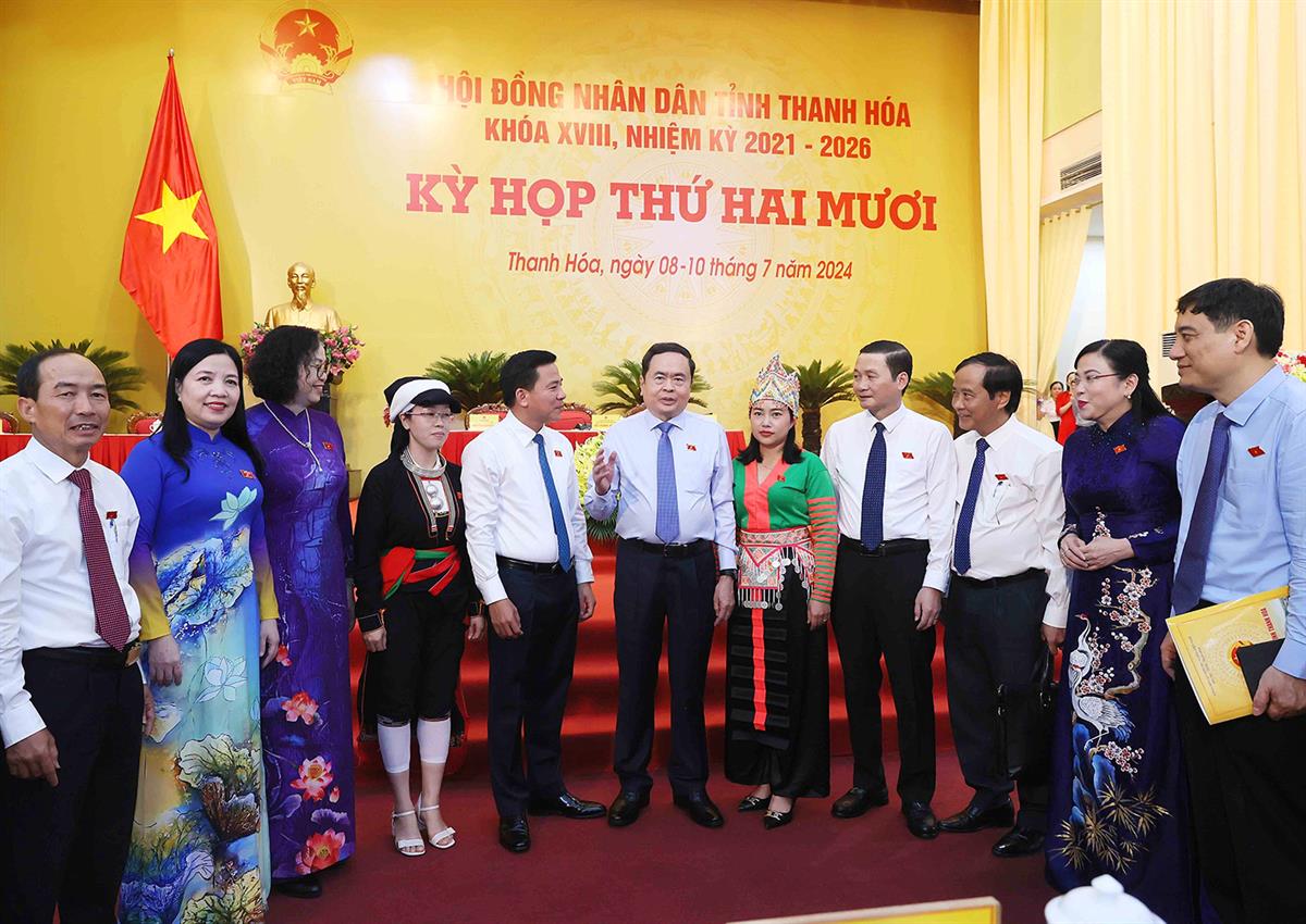 Ủy viên Bộ Chính trị, Chủ tịch Quốc hội Trần Thanh Mẫn với các đại biểu dự Kỳ họp thứ 20, Hội đồng nhân dân tỉnh Thanh Hoá khoá XVIII, nhiệm kỳ 2021 - 2026_Ảnh: TTXVN